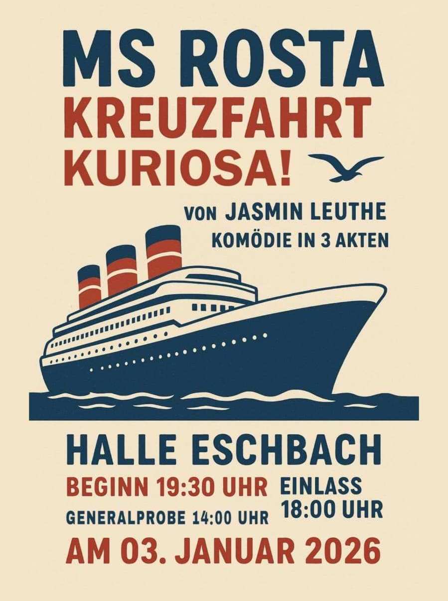 Gespielt wird eine heitere Komödie in drei Akten mit dem Titel „MS Rosta - Kreuzfahrt kuriosa!“, die von einer chaotischen Kreuz fahrt erzählt, bei der der Kapitän ausfällt und die Passagiere mit viel Witz das Ruder übernehmen müssen.